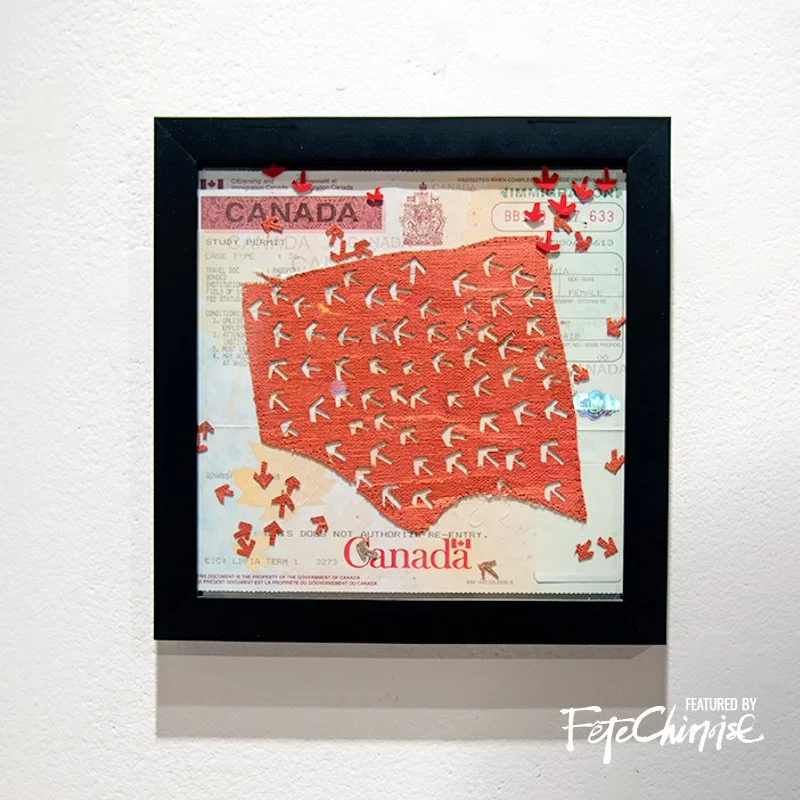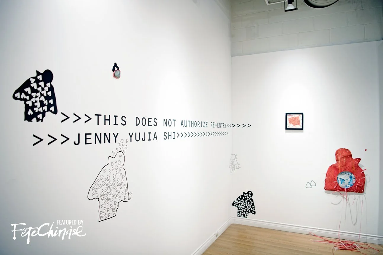 申請移民及爭取居留頓成了Jenny畢業後的首要目標。偏偏,因為藝術工作性質特殊,令她的申請特別波折重重。在漫長的申請和等待期間,她將整個過程透過創作記錄下來:以版畫、立體印刷技術展示出斑駁的多元文化痕跡;輪廓模糊的剪影,反映移民的無力及脆弱心情、一個又一個觸目的紅色箭咀取材自出多次出入境時證件上的印章圖案……各種創作元素零散地漂落,集合起來觀看,正好見證移民過程中經歷行行重行行的心路歷程。「我的作品承載了加拿大和中國兩個時空交積而成的人生感悟。畫中人擁有自己的故事,當中的線條、顏色和形狀等組合就像生活中的點滴交錯。觀眾從作品中以另一角度觀看,對照現實,同時為作品増添意義。」