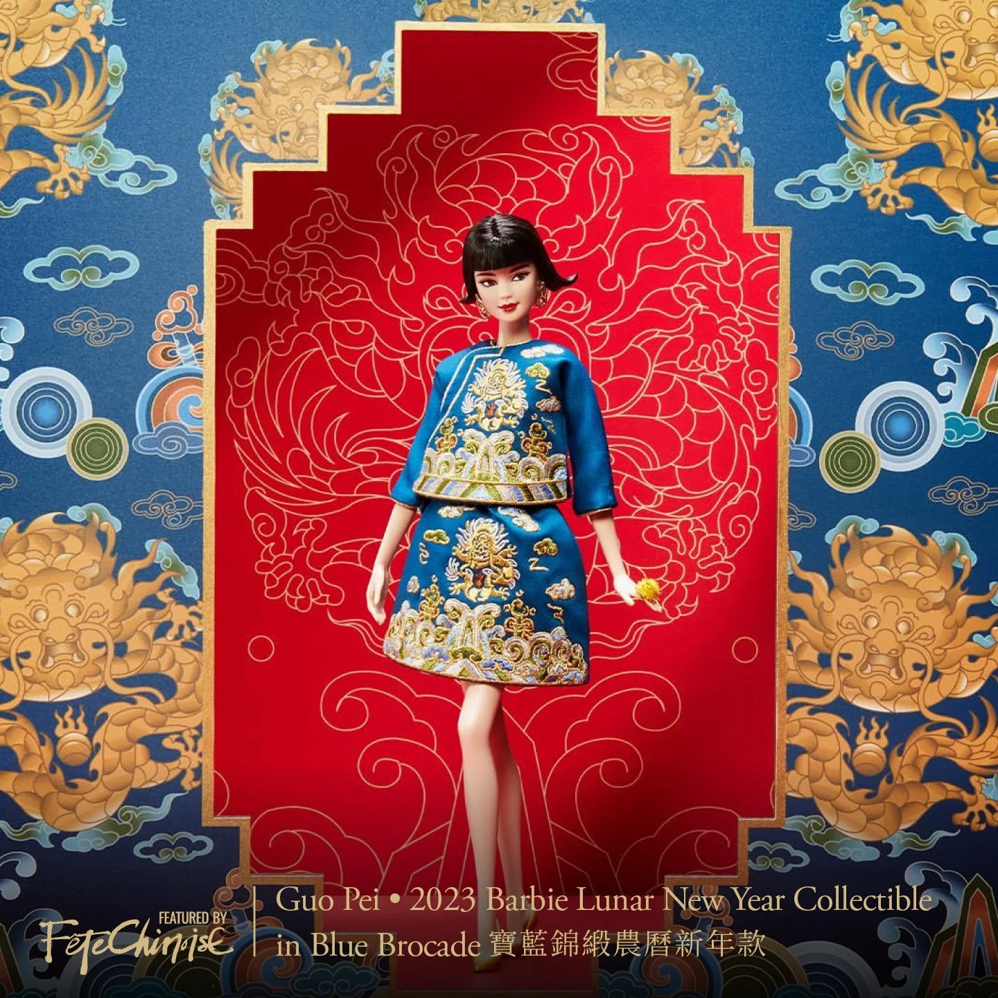 Guo Pei 2023 Barbie | Lunar New Year Collectible in Blue Brocade & Doll Wearing Golden-Yellow Gown