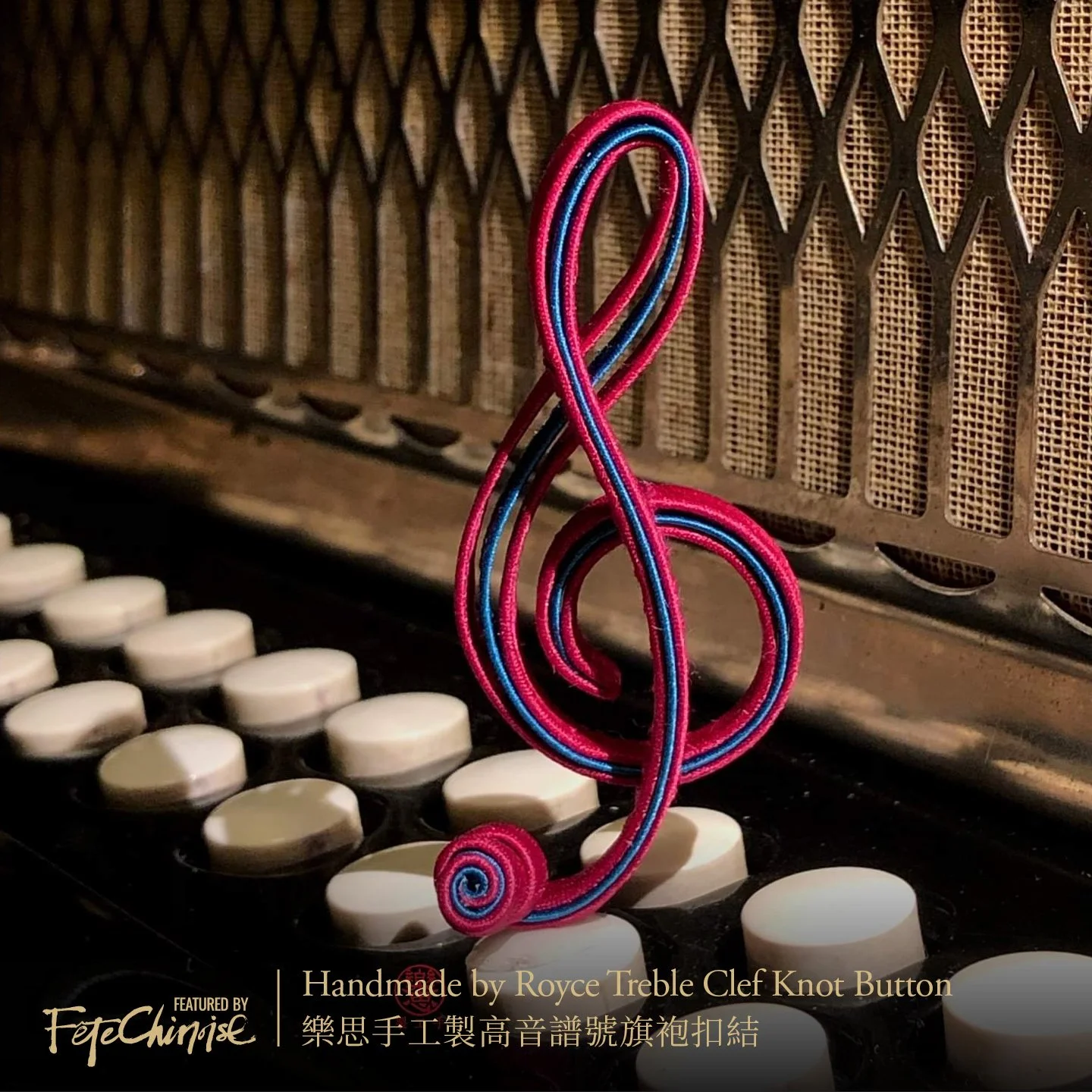Treble clef, or G clef, was originally just a simple letter 'G' written on the score and slowly evolved into its current shape. Royce Chau used the beautiful round curved shape of treble clef to make a modern Cheongsam button knot with traditional craftmanship, which is a perfect demonstration of mixing cultures and innovation.