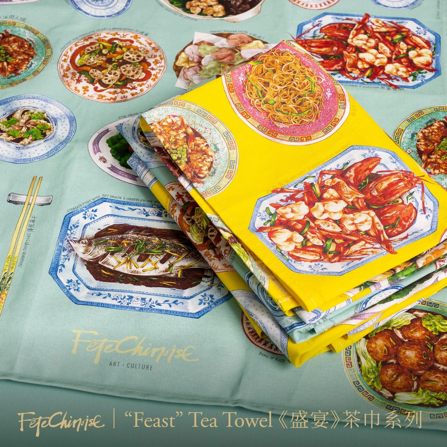 Fête Chinoise's "Feast" hand-illustrated tea towel features a parade of traditional Chinese dishes for a celebratory dinner, with a nod to many household porcelain dishes and familiar patterns. Steamed fish, lobster with ginger and scallion, Shanghainese pork belly, longevity noodles, and stir-fried lotus root are just some of the decadent dishes fondly remembered from childhood and still enjoyed today. In bright yellow and minty blue. Celebrate Culture.