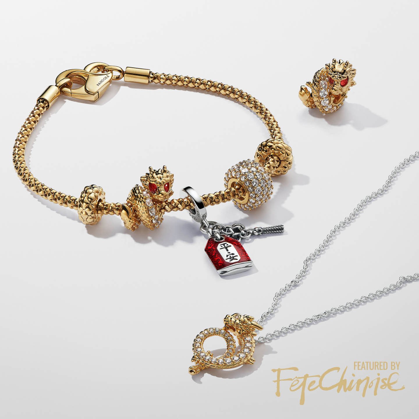 祥龍在十二生肖中名列第五,代表好運、力量、權力、智慧和健康。 14K 鍍金的祥龍魅力串飾呈現可愛的龍形設計,龍身一側鑲有寶石,另一側則是細膩的鱗紋,雙眼用上鮮紅色的梨形寶石,生動Q版。 雙色龍年短頸鍊貴麗典雅,其中以 14K 鍍寶石金蟠龍吊墜最為觸目,頸鍊釦旁以平安結作裝飾,細微處顯見經典。 兩款飾物均隱藏着滿滿的祝福。