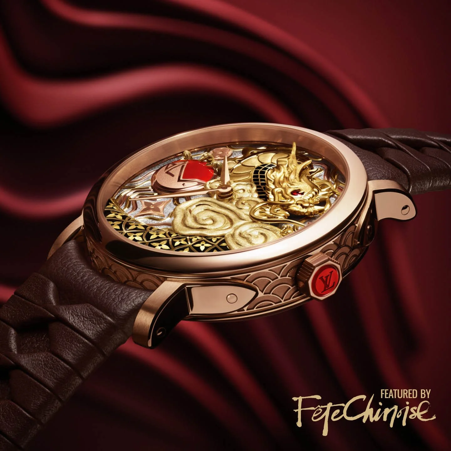 三款限量版腕錶靈感來自牌創始家族的第三代成員 Gaston-Louis Vuitton 的私人收藏,完美展現品牌製錶的精湛工藝。 限量 20 只,以三聯畫為設計概念,黃金和玫瑰金的設計使龍的形象更加栩栩如生,手握鑲嵌有GLV字母的紅玉髓。 使用鑲嵌技術呈現亞洲龍的精髓,大馬士革裝飾形成了層次分明的外觀,與自然界的紋理相呼應。 錶盤的龍紋以黃金或玫瑰金冷加工而成,鱗片則使用罕見的金箔琺瑯,呈現出豐富的層次感。 龍眼和 GLV 字母的紅玉髓相映成趣,煥發迷人的光彩。 其中大馬士革和金箔琺瑯等一度被視為失落的藝術工藝,與龍的崇高、充滿智慧的形象不謀而合。