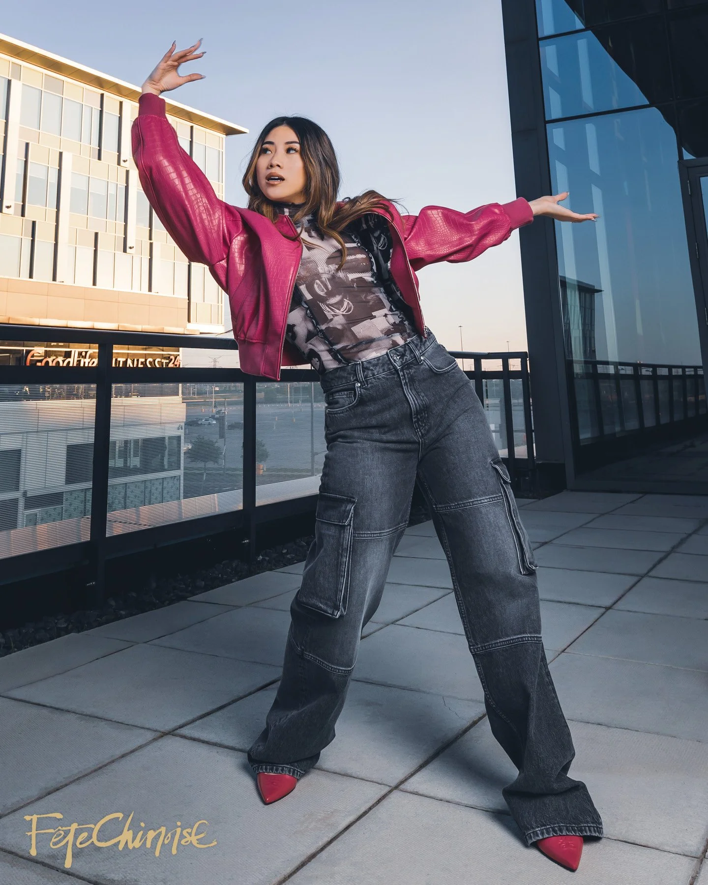 HUGO Pink Leather Bomber, Graphic Sheer Top, Cargo Jean and Pointed slingback Pumps.