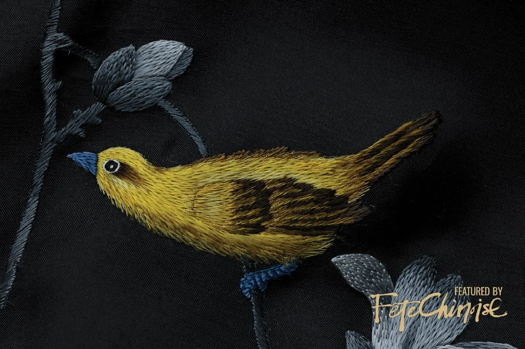 The embroidery of the Flowers and Birds design uses traditional Suzhou embroidery techniques such as scattered stitches, hair stitches, and rolling stitches. The magnolia is embroidered using the "包头" technique, standing gracefully, while the peony is embroidered with fine silk threads to showcase its elegant and delicate posture. The birds perched on branches have soft, fluffy feathers, and the addition of golden thread highlights the lifelike appearance of the golden-threaded bird. The work uses four color tones, with 4 to 12 different shades of silk thread. After more than 120 hours of embroidery, it beautifully captures the hazy night, the gentle breeze, and the serene ambiance of flowers and birds singing.