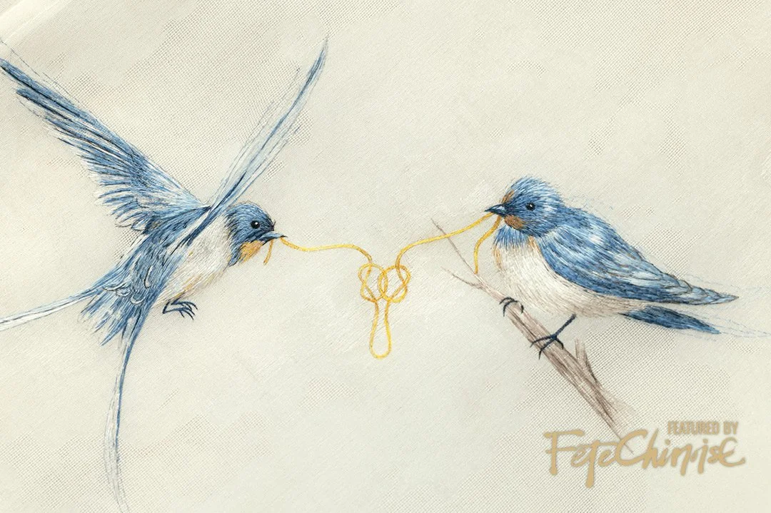 The embroidery work Two Birds was completed after 46 hours of effort. It primarily uses the "施针" technique, complemented by the use of contrasting stitches. With six color tones and 1 to 8 different shades of silk thread, the embroidery vividly brings to life the playful scene of the birds, symbolizing their "unity of heart." The image is lively, energetic, and full of charm.