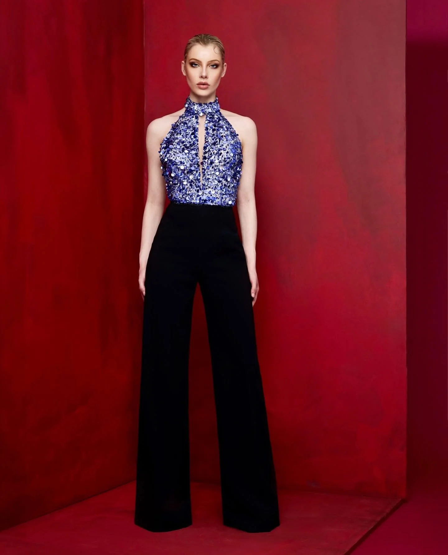 Eveningwear is no longer limited to restrictive gowns—tailored jumpsuits are emerging as a bold new Black Tie option for women. This sequin-embroidered, high-neck jumpsuit by Lucian Matis steals the spotlight with its cool, blue-violet hue reminiscent of a starlit night sky. Paired with wide-leg black trousers, the look balances opulence with strength, expressing a sleek, elegant, and independent spirit.