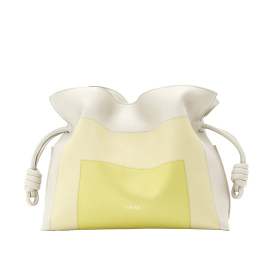 Footwear comes in the form of GUCCI’s cream patent leather Mary Jane heels, with a rounded toe and block heel that strike the perfect balance between vintage charm and wearability—each step feels as effortless as a summer breeze. The look is paired with a LOEWE drawstring pouch bag in a two-tone palette of soft yellow and white. Its relaxed silhouette brings a vacation-ready ease, while the colour pairing complements the dress to create a harmonious visual flow.