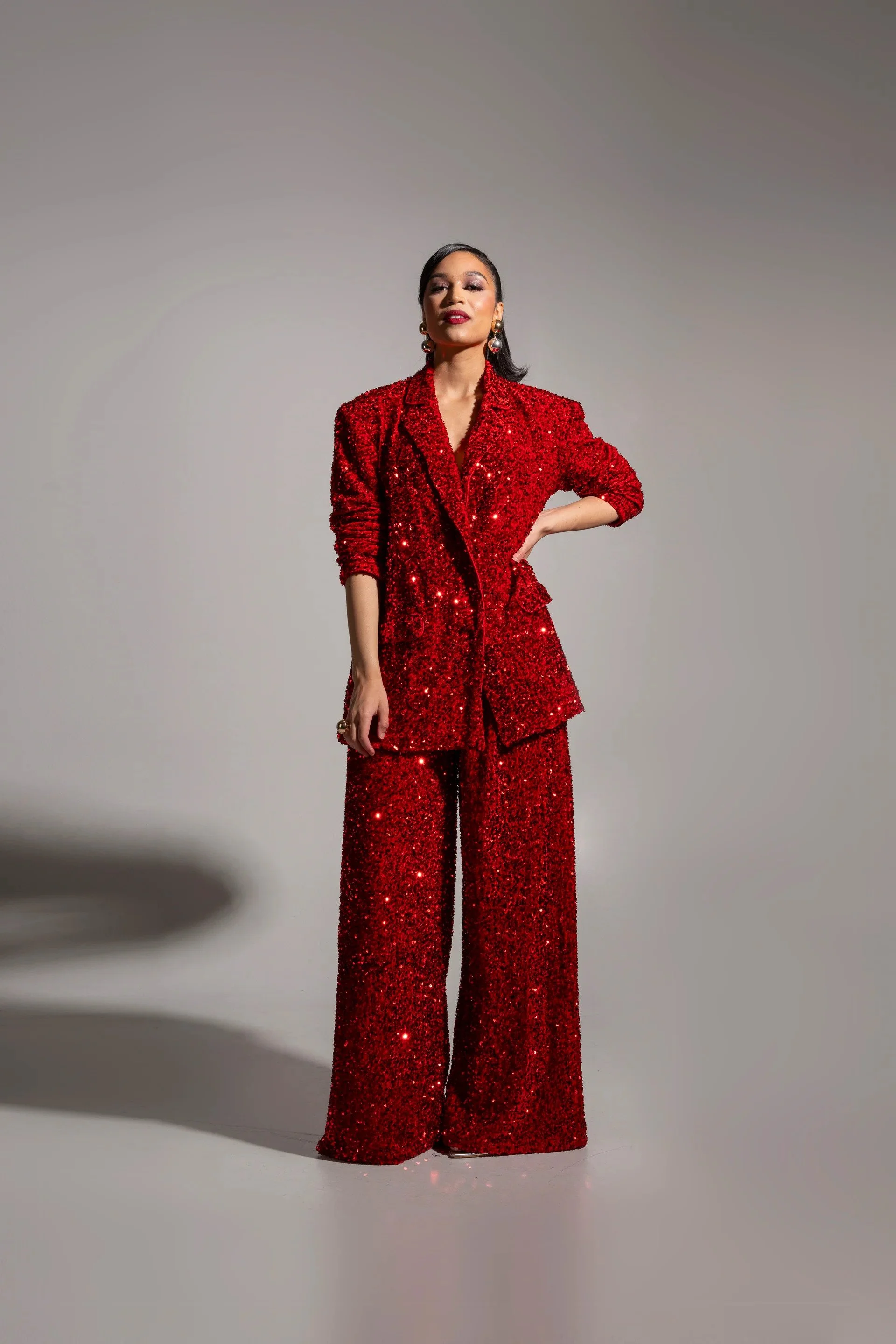 Just as every woman needs a little black dress, a bold red ensemble is a fail-proof choice for ringing in the New Year—whether it's the Western countdown or Lunar celebrations. This sequined power suit by OFUURE is a modern take on festive glamour. The sharp, structured blazer with broad shoulders pairs effortlessly with high-waisted wide-leg trousers, creating a silhouette of confidence and sophistication. Layered with a matching sequin bra top, the look redefines the traditional suit—bold, chic, and unapologetically modern.