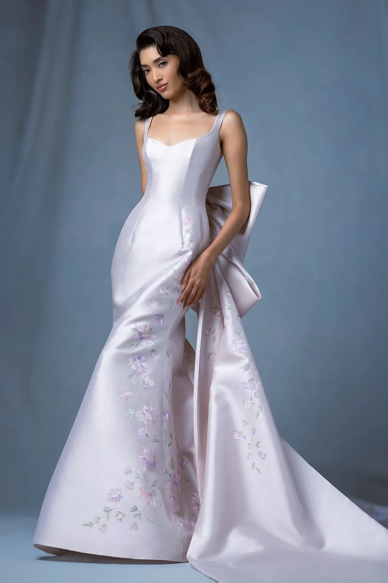 This blush satin gown by Canadian designer Ines Di Santo sculpts the body with graceful precision. A removable, sculptural bow at the back adds dramatic flair, while delicate embroidered petals along the hem echo the freshness of spring.