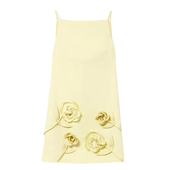 The centerpiece of this look is a buttery yellow spaghetti-strap dress by SELF-PORTRAIT, featuring soft, sculpted satin roses that add dimension to the gentle hue. Light and breezy, it calls to mind summer flowers blooming under golden sunlight.