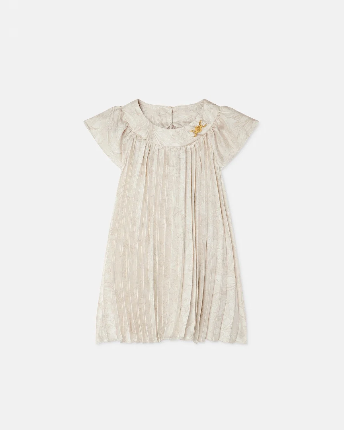 A short-sleeved pleated dress with a subtle Barocco print and Medusa accents. Chic, playful, and perfect for little ones’ special occasions.
