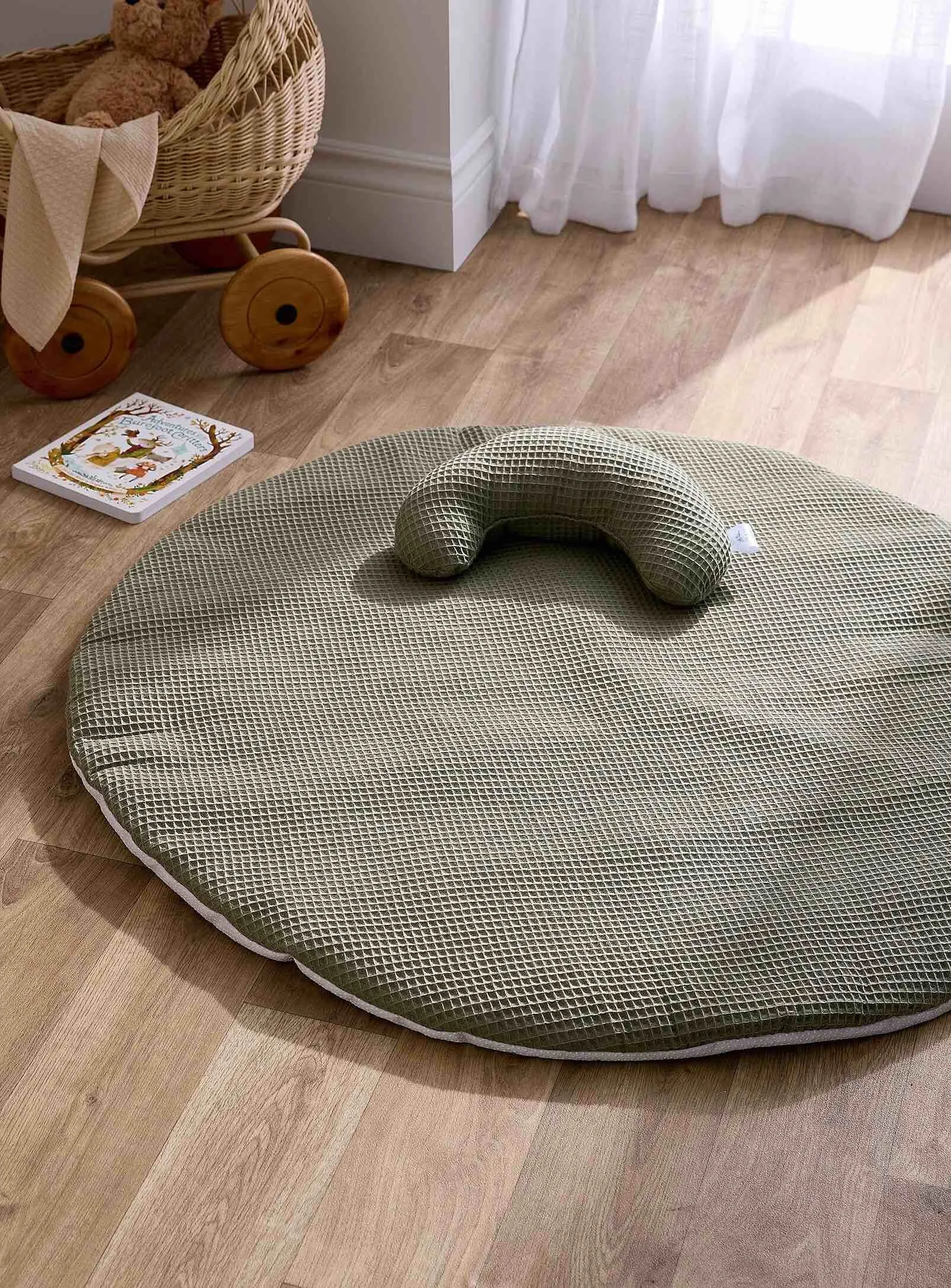 A cozy set for little ones, featuring a round play mat and a tummy-time cushion. Soft, safe, and perfect for play and early development.