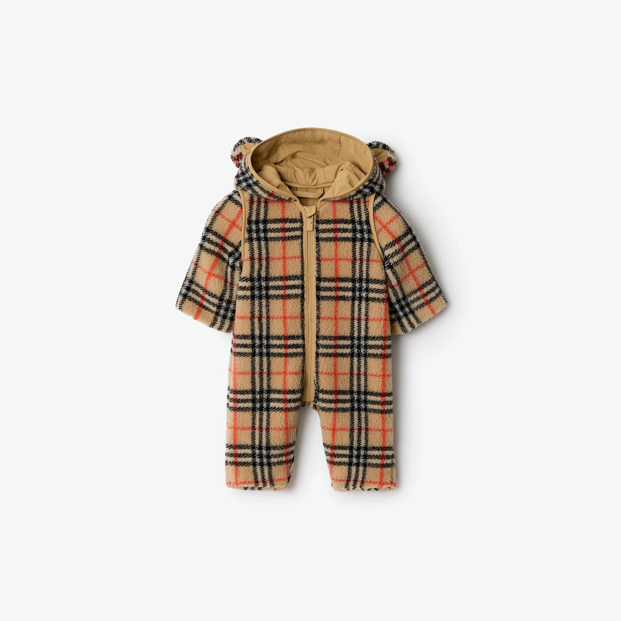 A cozy fleece jumpsuit featuring the signature Burberry Check in sand beige. Fully lined and finished with playful hood ears inspired by Thomas Bear, it’s a stylish and fun choice for little ones.