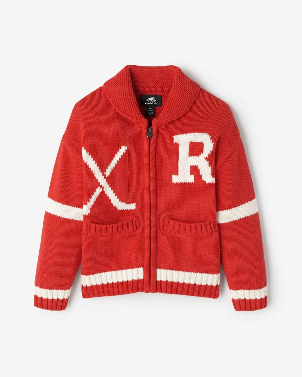 A cozy heritage-inspired knit with a bold hockey print, shawl collar, and front zipper. Perfect for layering little ones in style during chilly days.