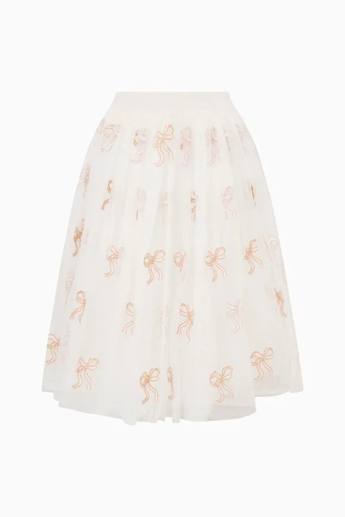 A dreamy tulle skirt from the Secret Crush capsule, sprinkled with embroidered Coquette Bows. Featuring a fixed waist and a flowing, pleated silhouette, it’s a festive and whimsical choice for holiday outfits.