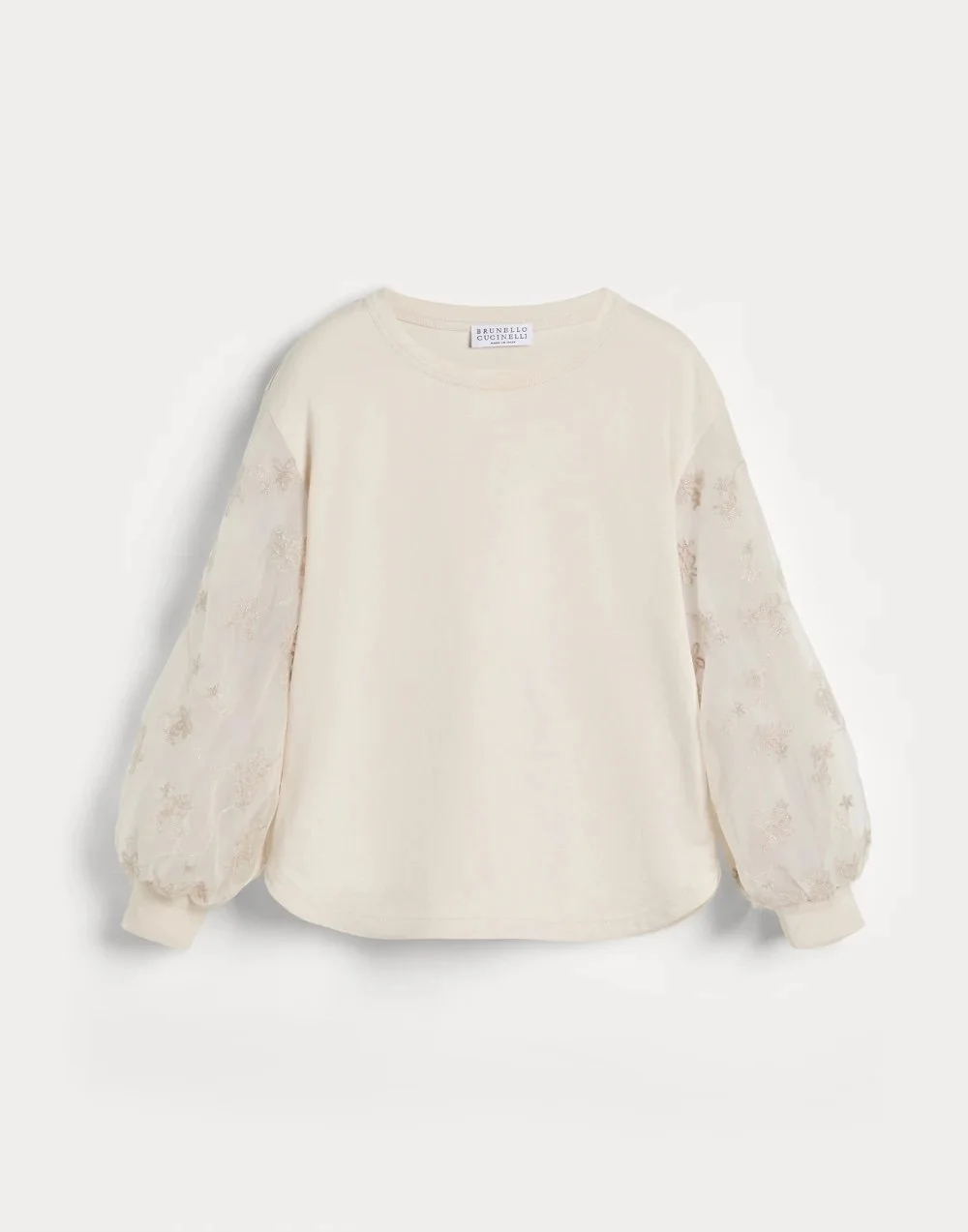 Brunello Cucinelli | Cotton jersey T-shirt with crispy silk sleeves and sparkling blossom embroideryte