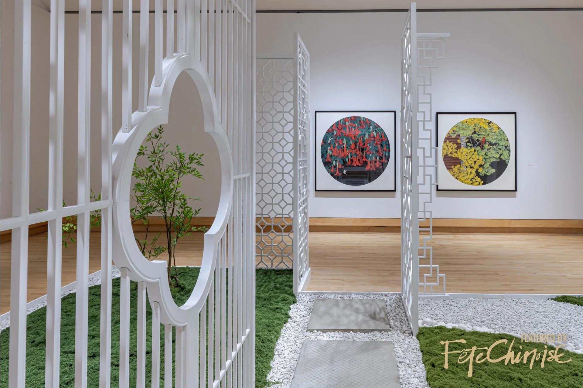 The current exhibition reflects Kejie’s layered aesthetic. Lattice screens arranged in various Chinese window patterns blend traditional elements with contemporary simplicity, echoing her sensibility and the finely articulated details found in her paintings.