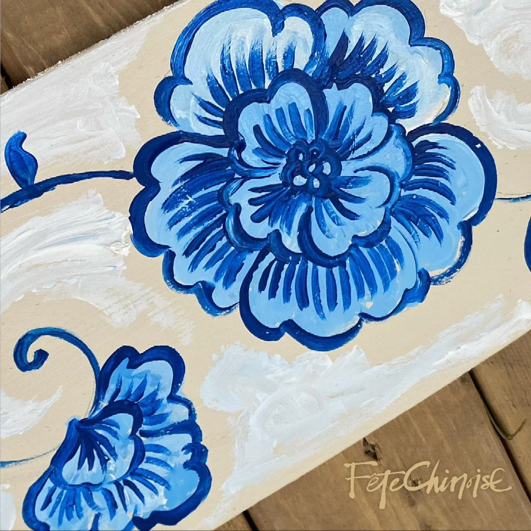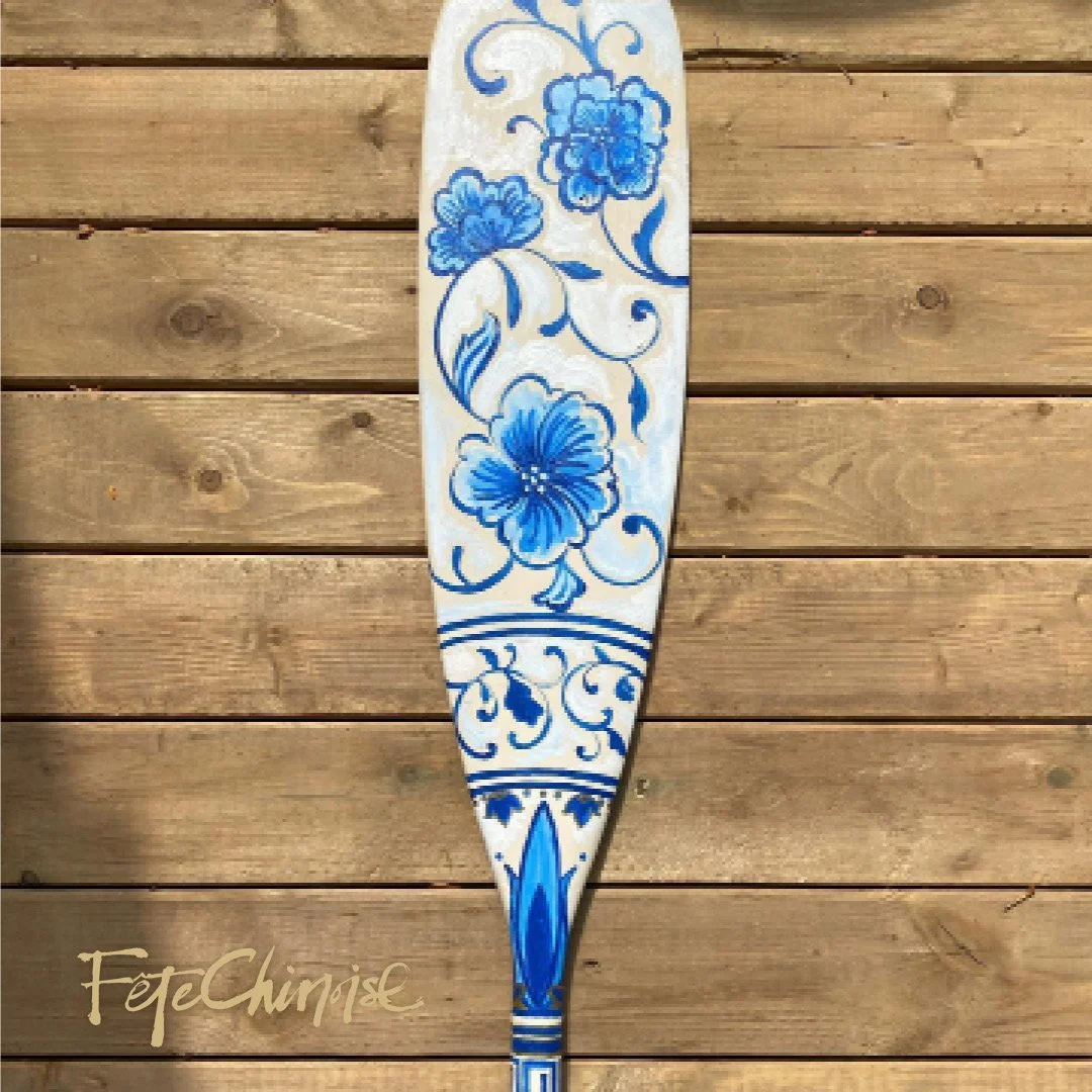 2020 Design: A classic blue-and-white porcelain-inspired paddle, inspired by the design of our cover of the 6th Edition of our magazine, Time + Tempo. This paddle was painted to resemble a delicate vase with a continuous wraparound design—lovingly created during the pandemic's first year, baby in tow, by our Editor-in-Chief Deborah Lau-Yu. Acrylic paint on a wood paddle.